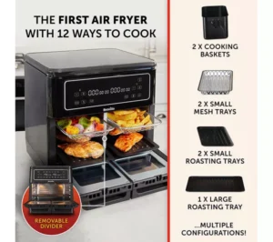 It comes with baskets, mesh trays and roasting trays for cooking different dishes